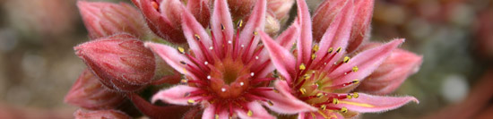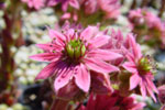 Sempervivum exists in many shapes and sizes, from glossy to matt and from velvet to spidery web patterns. Some species actually have a sticky feel to them. They are available in many colours: green, pale yellow, red, orange, brown, purple and grey. Some are nearly completely black. The colours are particularly attractive in the spring and autumn, and some Sempervivums take on a completely different colour in the winter. This can also be very attractive even though the plants do not grow during the winter months. A wide range of different shapes exist: rosettes or small balls, or joined together to form a carpet. Sempervivum spreads by means of offsets or shoots, and seeds and forms a flower from the heart of the plant. When the flower has finished blooming, the plant dies and offsets around the mother plant grow further. This phenomenon can be seen among other plants in nature, such as the Aeonium, Agave and Bromelia species. All these features together make the Sempervivum a very interesting plant